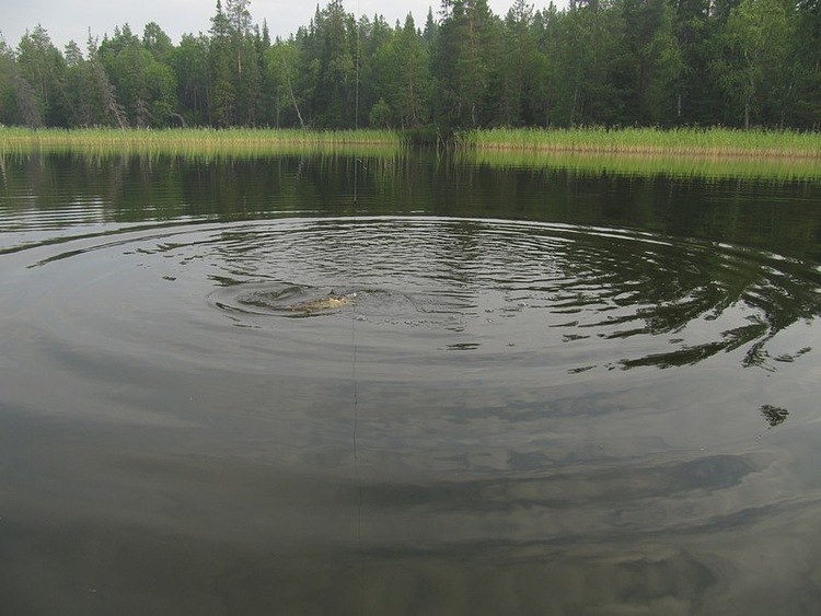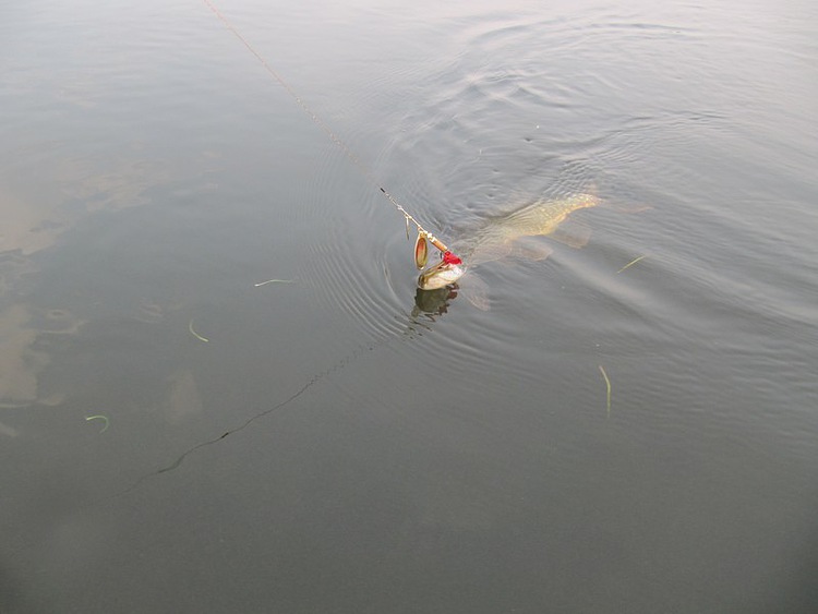 Очередной заброс. Блесна подошла к кончику удилища, начинаю поднимать вверх и сквозь воду вижу, щука подходит, на пригляд килограмма на два с половиной. О, как! Заинтересовало видать её вращение блесенки. Сейчас повторим проводку. Заброс, да рука дрогнула от нетерпения и вспыхнувшего азарта. Шлепнулась приманка прямо в щучью травку, потянул на себя.