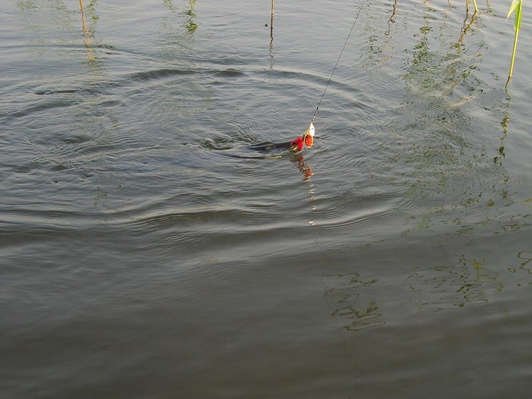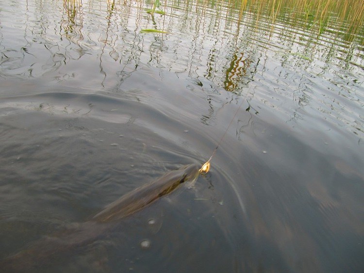 Иногда заброс сделаю от берега, да и на ходу подматываю блесну. Вдруг резкая потяжка, даже оторопел. Так далеко от берега, почти на полной дальности моего заброса. Быстро рву на себя уду. Сопротивление сильное, нить уходит в сторону. Кричу от радости: «Щука!» Ребята потом сказали, что аж в лодке подпрыгнули на том берегу от возгласа. Медленно с периодическим треском фрикциона подвожу к краю камыша. Мощный бурун на поверхности.