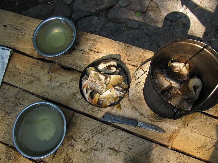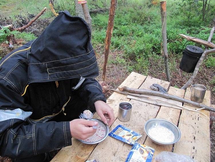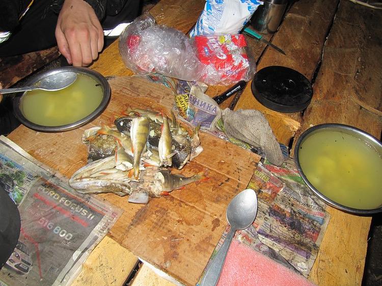 Почистили, посолили рыбу, сварили макарон, забрались под полог, чтоб комары не доставали, накрыли стол.