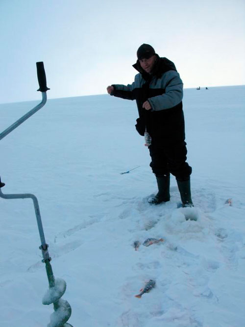 Но пятак быстро кончился, разбегаемся... Хлебодаров и Дима втыкаются в окуней. Но уже не стайных – с лунки 1-5 штук. То есть всё то, что под лункой стоит – тут же клюёт. Новые не подплывают...