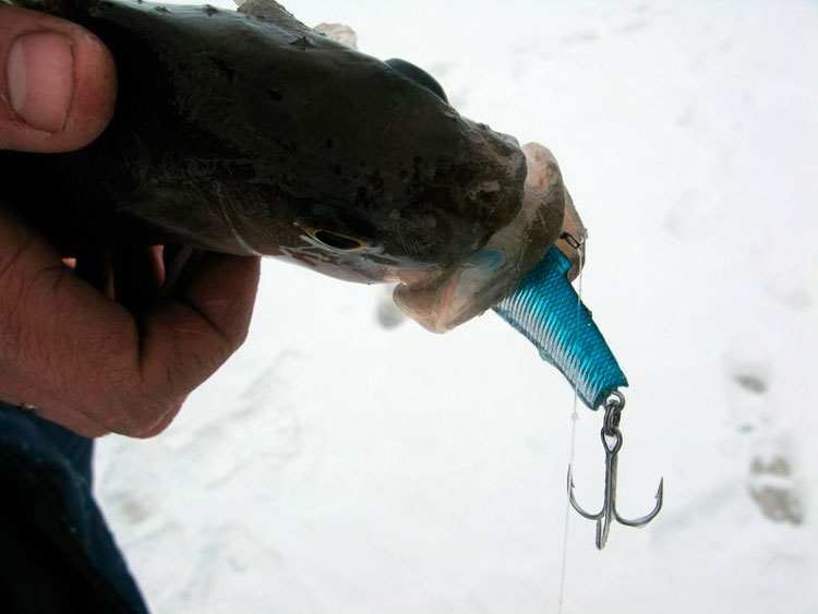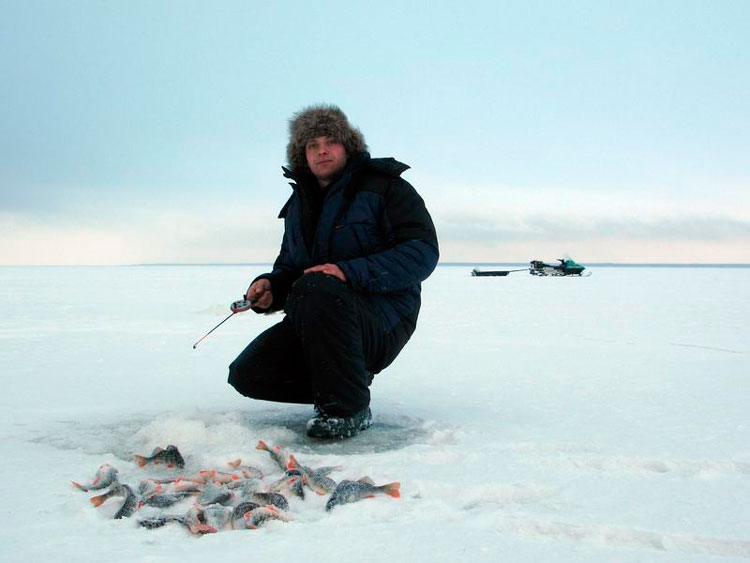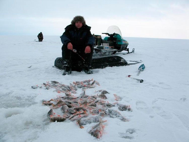 Лунки с прошлой рыбалки замело снегом, не нашёл свою золотую. Зато на месте набуренного воткнулся в слуд... Бурю первую лунку и тут же тычок. Попадаю на серийную – ловлю около пятнадцати хвостов. Подлетают парни, помогают. Серёга сразу ставит ратлин – очень злые поклёвки, говорит, к тому же эта приманка реально сортирует окуня.