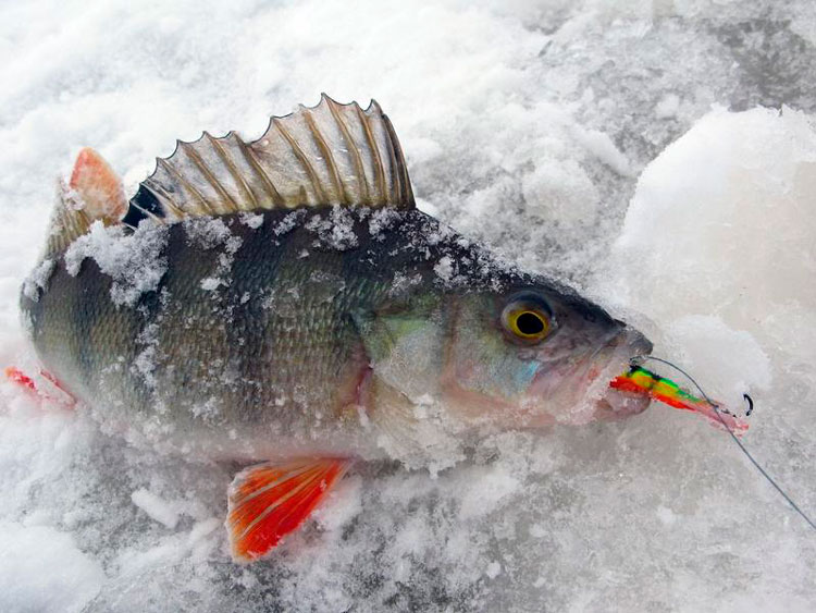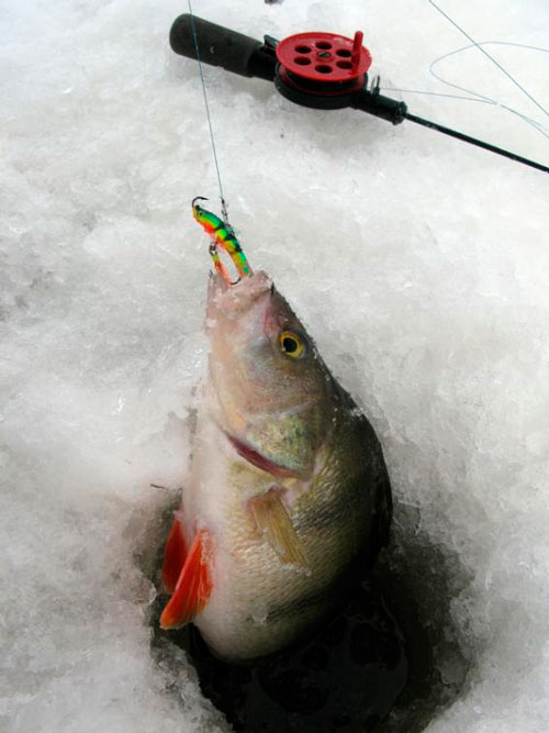 Чудеса всё чудеснее. На рапаловскую пятёрку, на которую ловил с утра, таких экземпляров не было. Ещё один полосатый красавчик на льду. Aqua рулит! :) Что интересно, у крупного окуня никаких тычков, подбросов – уверенно хватает баланс и пытается уплыть.