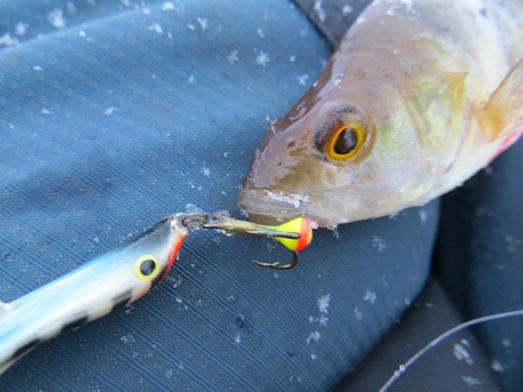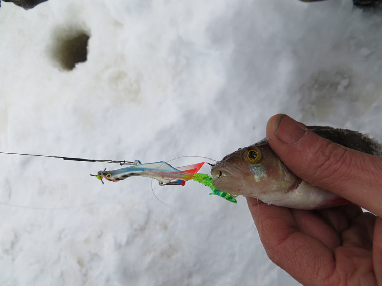 Проказника успел подцепить, когда он атаковал передний тройничок. Хорошо работают тройнички с капелькой. Заметил, их окунёк уважает.