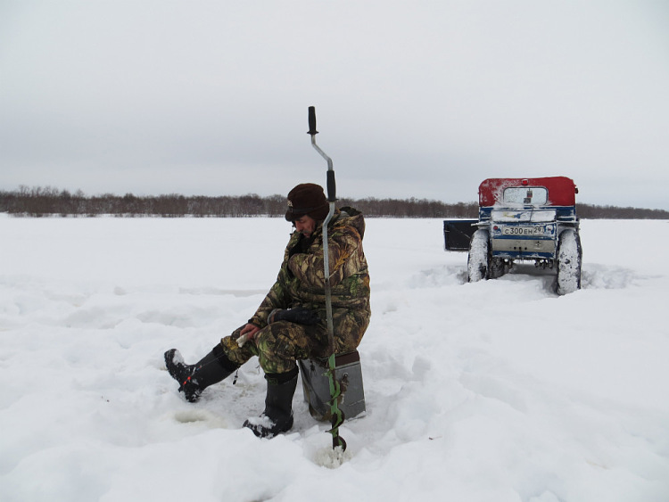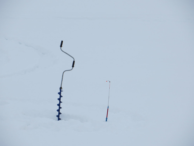 Отхожу от нашей стоянки метров с десяток назад. Делаю две лунки одну чуть правее основной линии ранее сверленых дырок, вторую немного к берегу. Глубина лова замечена по последней лунке. Сейчас мне надо узнать, есть ли изменения в рельефе дна. Опускаю ближе к берегу. Мельче на тридцать сантиметров. Не так критично, и все же понимаю, что при отсутствии клёва самое то сместиться на лунку, которая правее и подальше от берега.