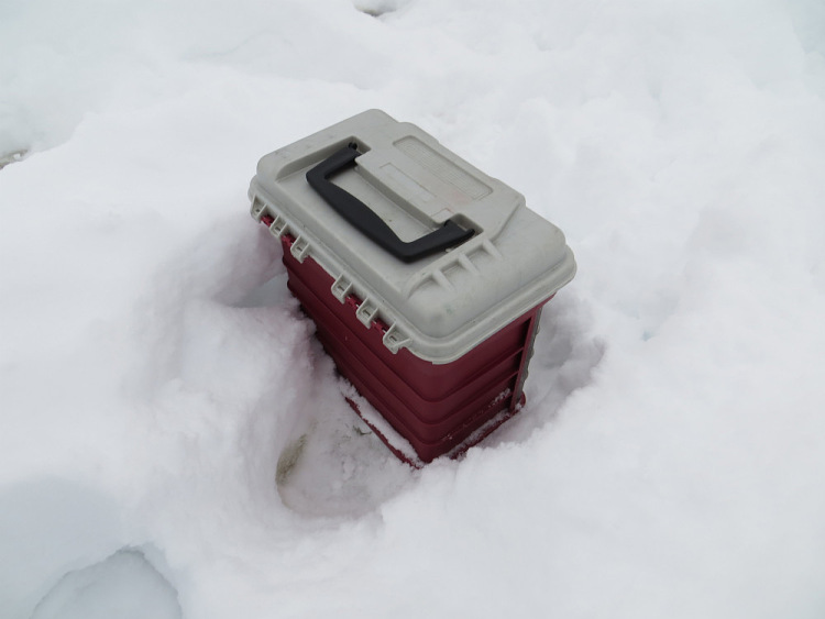 Бур мигом вкручивается в лед, откидываю слуз ногой. Уду из ящика, приманка нырк ко дну. Приподнимаю на метр и начинаю спуск.