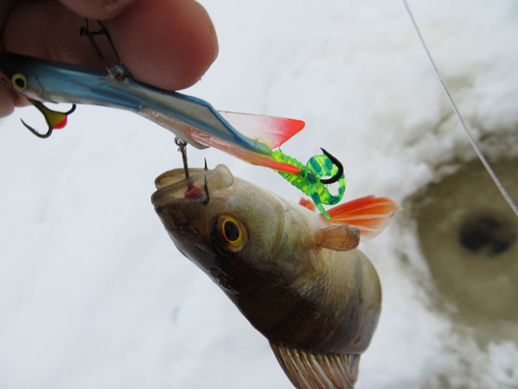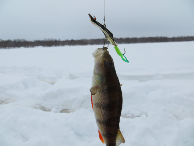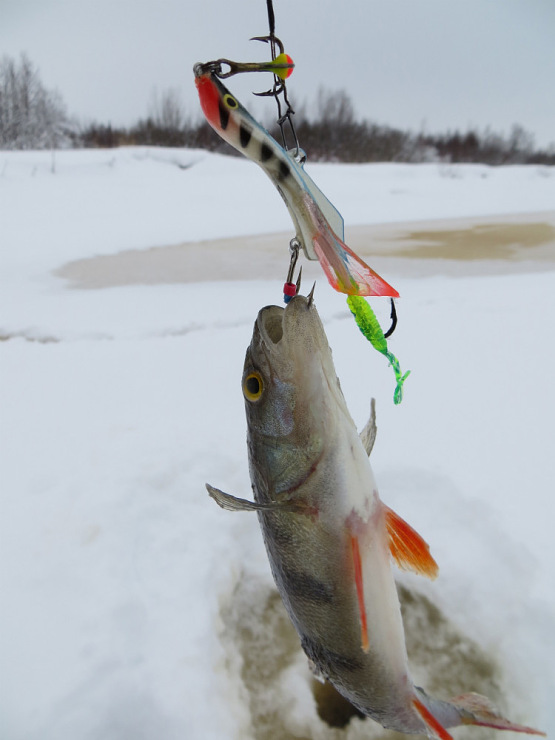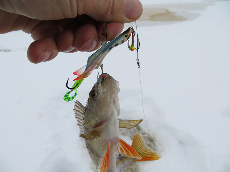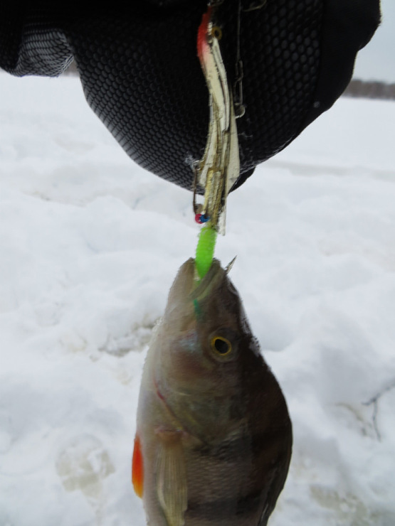И тоже на двойничок. Возможно, стало светлее, и окунь стал видеть нижнюю подвеску. Возможно, перевел атаку на более мелкий корм. Двойничок помельче тройничка и тем более виброхвоста.