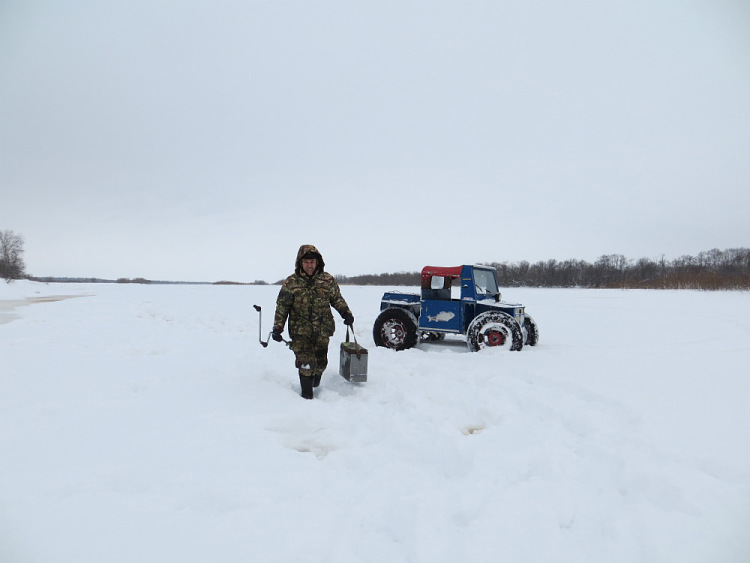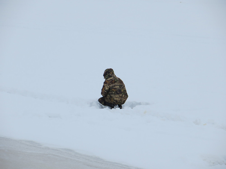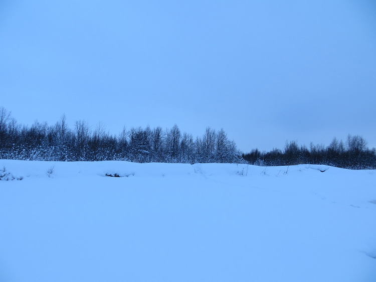 На старых лунках никого. Да и в Печах никого. Далеко на повороте три точки, трое рыбаков пешком пришли. Удивляюсь, как они добрели по выпавшему снегу. По колено будет, местами вода. Точно говорят: "Охота пуще неволи"