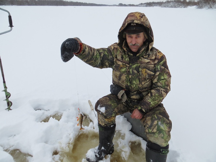 Ничего я не отстаю. Меняю лунку, смещаюсь вперед. Поклевка в полуметре от дна. Есть окунишка.