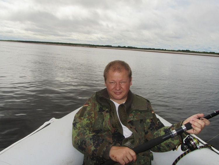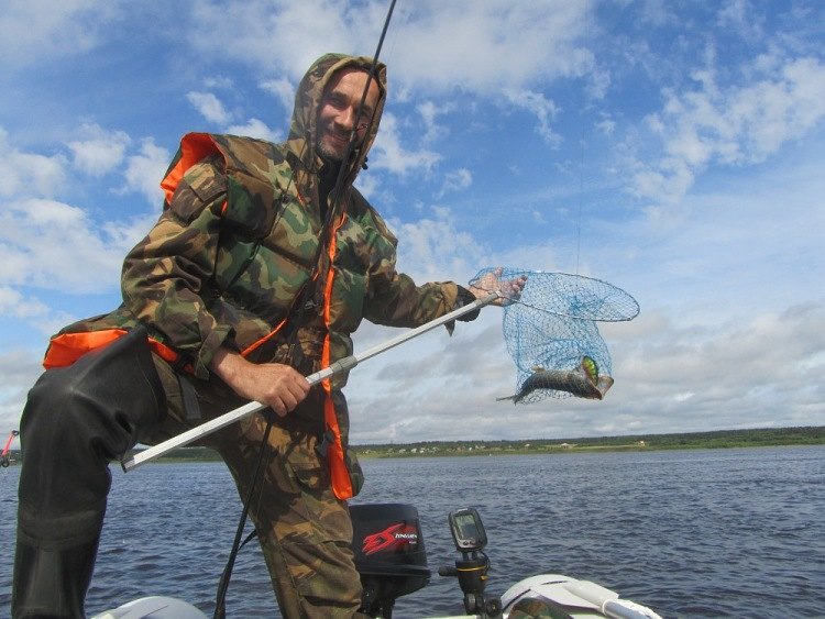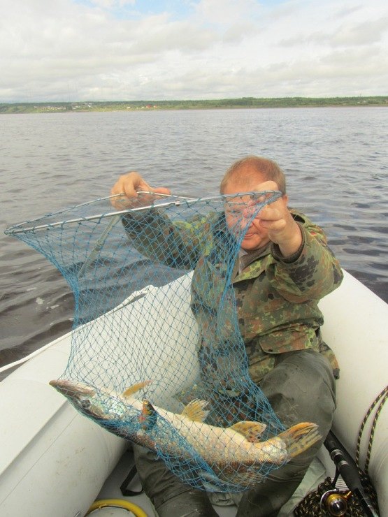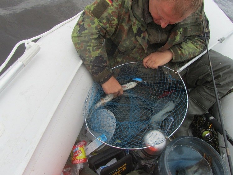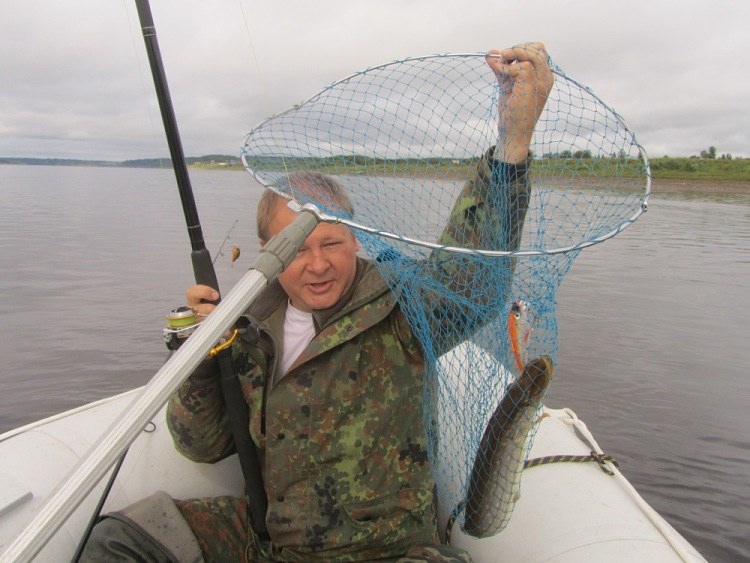 Поклёвка. Резкие рывки. Вывожу неспешно. Ближе и ближе к лодке. Сопротивление странное, то рванет, то будто бревном подвиснет. Михаил черпает рыбинку на борт.