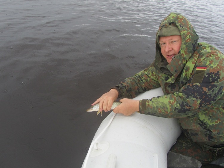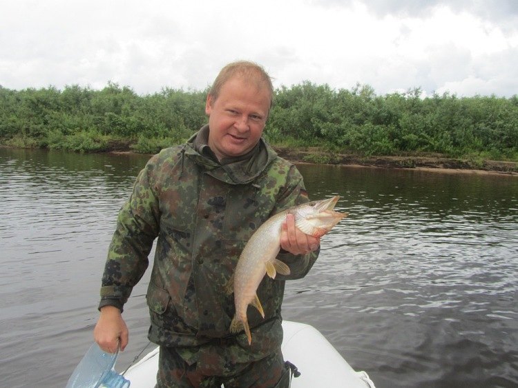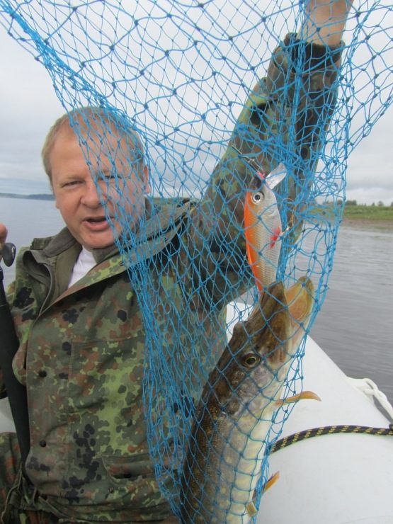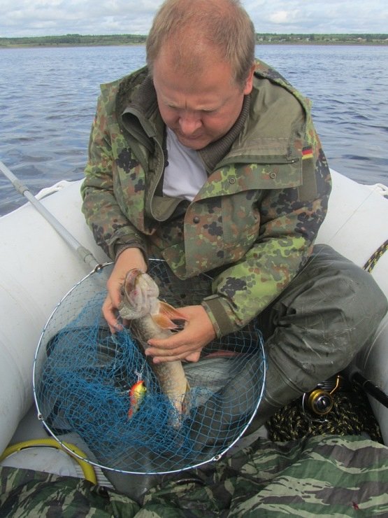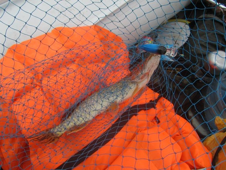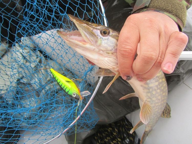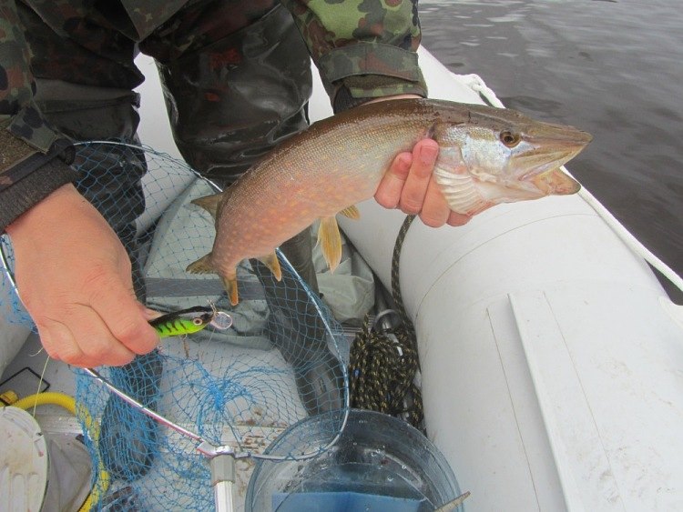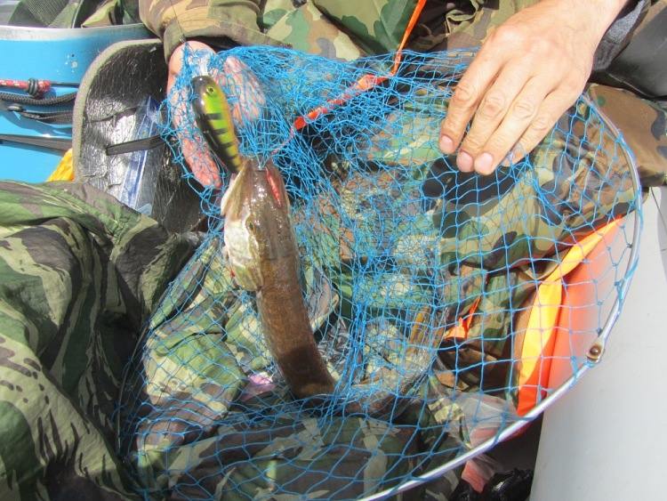 Дальше потычек длительное время нет, хотя место, судя по показаниям эхолота перспективнейшее. Уж на подходе к конечной точке маршрута у Михаила цепкая потяжка. Товарищ взмахивает удилищем: «Есть!». Стоп машина. Хватаю подсак, готовлюсь принять первую рыбку настоящей рыбалки. Рыба сопротивляется, не хочет идти, сильно подтаскивает плетенку на себя. Наверно, сказывается мощное течение вдоль берега. Метрах с семи видим щучку. Миша подводит к борту, я ж подхватываю снизу подсачником