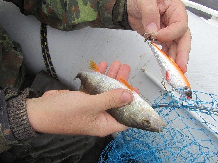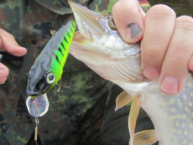 Спускаемся ниже по протоке. Ровное дно сменяется резкими перепадами глубин, потом резкий свал, яма. Воблеры идут примерно метра два над дном. Поклевок ни ждём. И вдруг вновь потяжка. Кислотный Буба отличился