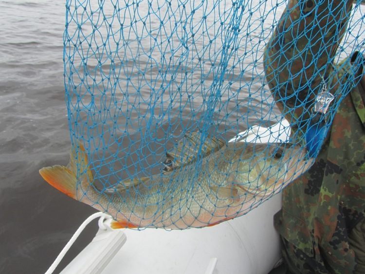 Доходим до бакена, отсюда решаем, пересекая пороги под углом, уйти к южному берегу. Странно в каменистых грядах ни единого выхода. Я то предполагал, что отличное место для укрытия хищника. Видать ошибался. Недостаточный опыт в ловле на троллинг сказывается. Ближе к берегу пороги заканчиваются, выплываем на песчаное русло. У Михаила тычок, он разбирается со спином, и тут же у меня потяжка. Весело мотаем катухи, тут же переговариваясь, как будем выводить вместе рыбу. Подсак то один, да и у обеих руки спинами заняты. У Михаила сход. Я стараюсь вести рыбу плавно без рыков, даю ей отыграть потяжки и вновь постепенно сокращаю расстояние между нами. Проказница пытается обойти лодку кругом. Встаю повыше, поворачиваю кончик удилища ближе к напарнику. Из глубины поднимается окушок. Михаил подхватывает подсачником.