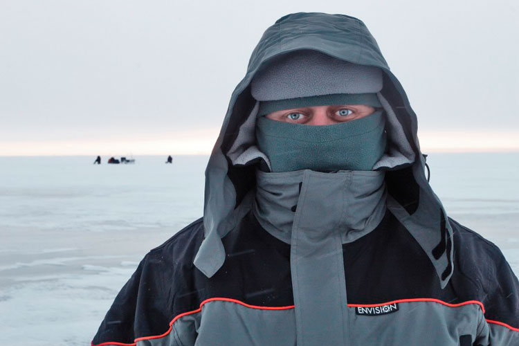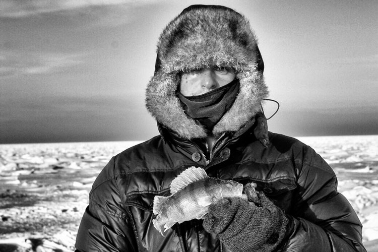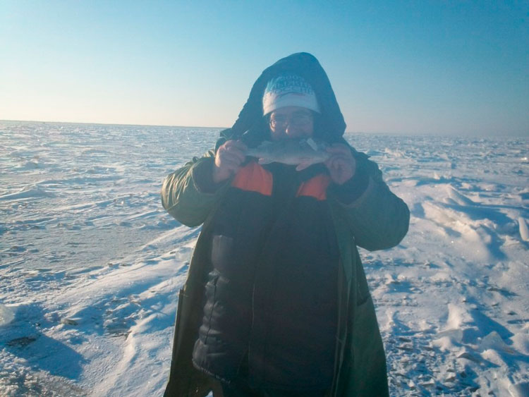 Мороз, правда, неслабый, но без ветра это не так уж страшно - только пальцы рук, вынутых из меховых рукавиц моментально застывают. Достанешь фотоаппарат, сделаешь один кадр - и всё, пальцы уже скрючило! Особенно жаль было Андрея - он фоторепортёр по профессии, да ещё и новичок в зимней рыбалке, тяжело ему пришлось. Он с собой аппаратуры взял больше, чем у меня снастей - здоровенный кофр с камерой и несколькими объективами таскает, всё время снимает, ловит красивые кадры - фанат своего дела! Руки-т он конкретно подзастудил - но вроде без обморожений обошлось. И рыбу свою, несмотря на очень полохой клёв, Андрей всё-же поймал.
