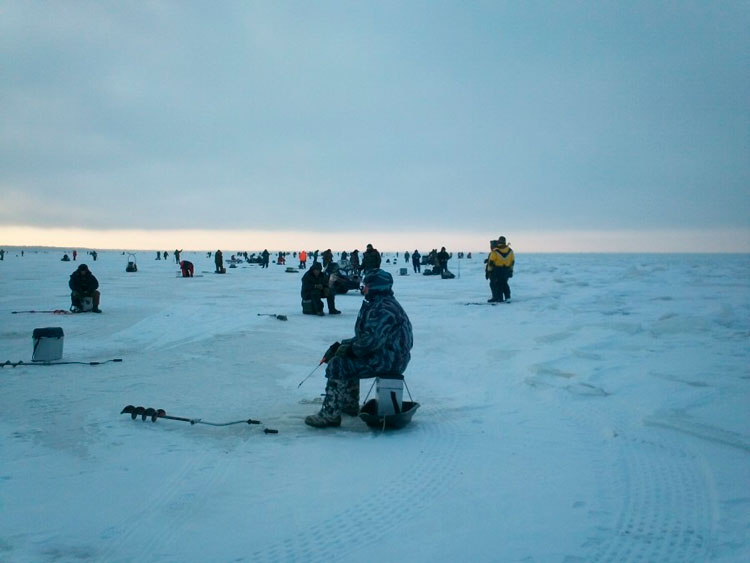 Следующая рыбалка состоялась тоже по верной информации о том, что в Дубно сравнительно недалеко от берега подошла стая ряпушки, а за ней - крупный и активный окунь. Вечером, после активной переписки на форуме, большинство единомышленников, естественно, решили ехать туда. Забегая вперёд, скажу, что группа форумчан на льду собралась действительно немалая.