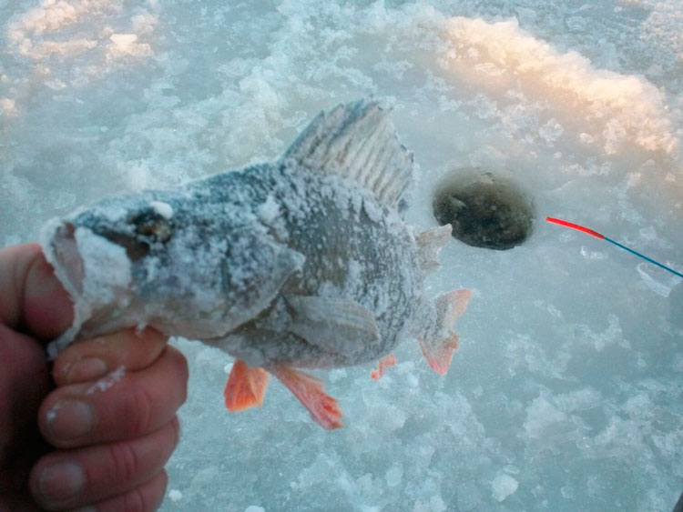 И наконец-то на очередной, уж не знаю, какой по счёту лунке, клюёт-таки первый окунёк!