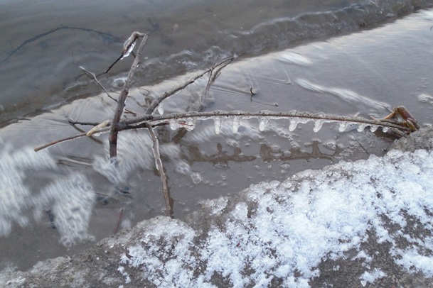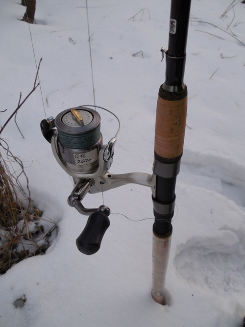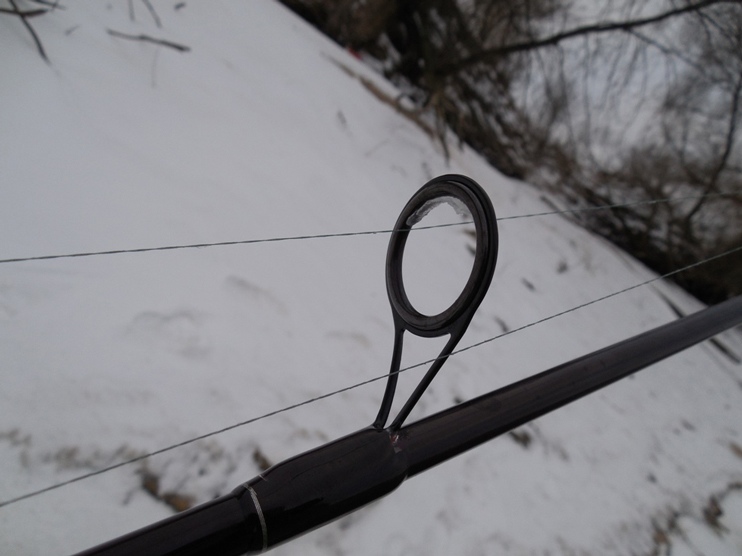 Копаясь в рюкзаке в поисках бутербродов, нащупал жидкий силикон в виде спрея против обмерзания лески и колец, и подумал, а понадобится ли он мне сегодня? Обследовав леску, тюльпан и пропускные кольца удилища, лед был только на первом от катушки пропускном кольце, что не может не радовать.