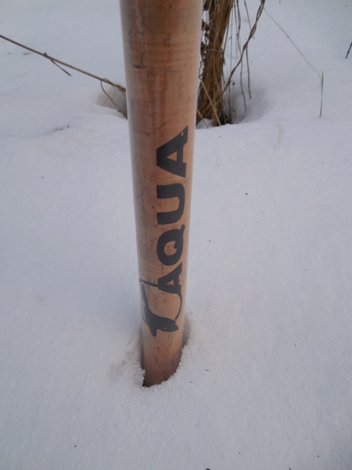 Спустившись, решил сделать привал и получше рассмотреть спиннинг. Рукоятка удилища удобная, под пленкой (которую я забыл дома снять) находится пробка, с логотипом фирмы «AQUA».