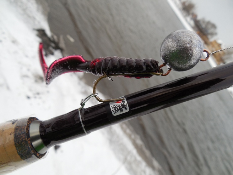 Захотелось сменить твистер, в прошлом году в этих местах неплохо работали темные цвета, нужно попробовать их и сейчас. Что бы при движении по берегу не ломать дужку катушки, в спиннинге предусмотрена специальная металлическая «петелька», что бы цеплять приманку именно за нее.