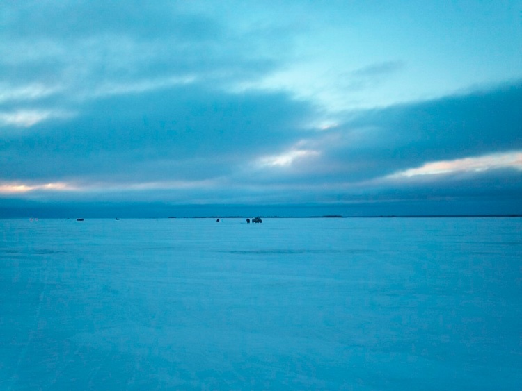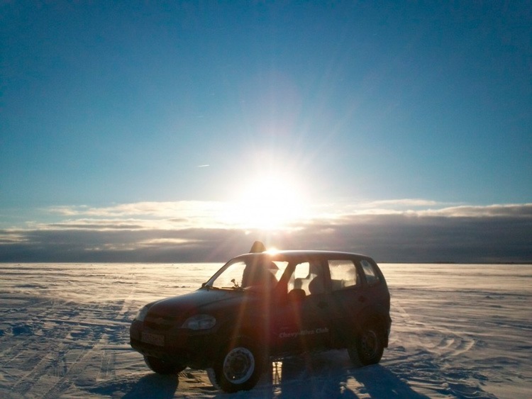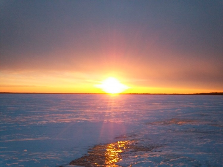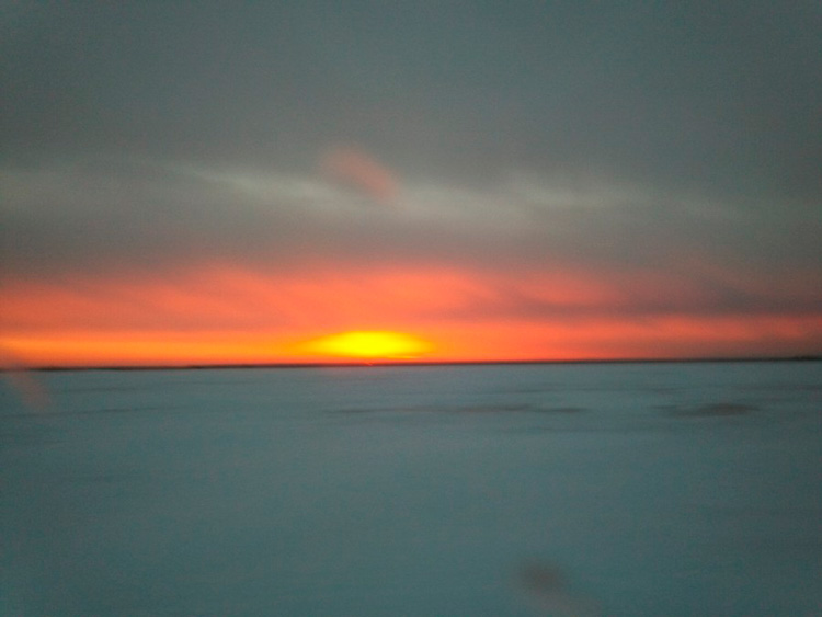 "Вектра" с нашей с Саней помощью в виде дополнительной тягловой силы вылезла из сугроба и почти до берега доехали без приключений. К берегу подезжали при свете какой-то нереальной "атомной" зари.