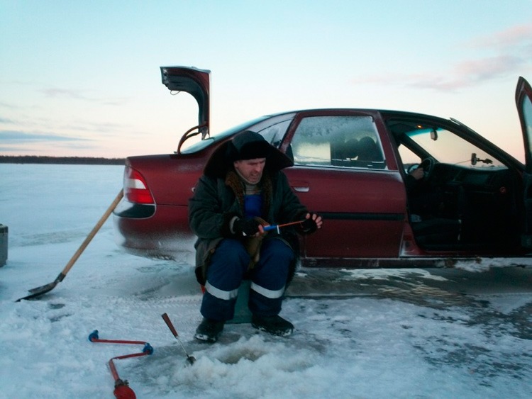 Одному Сане не терпится - первым делом он просверлил лунку возле машины и пока мы с Андреем возимся, уже разматывает удочку.