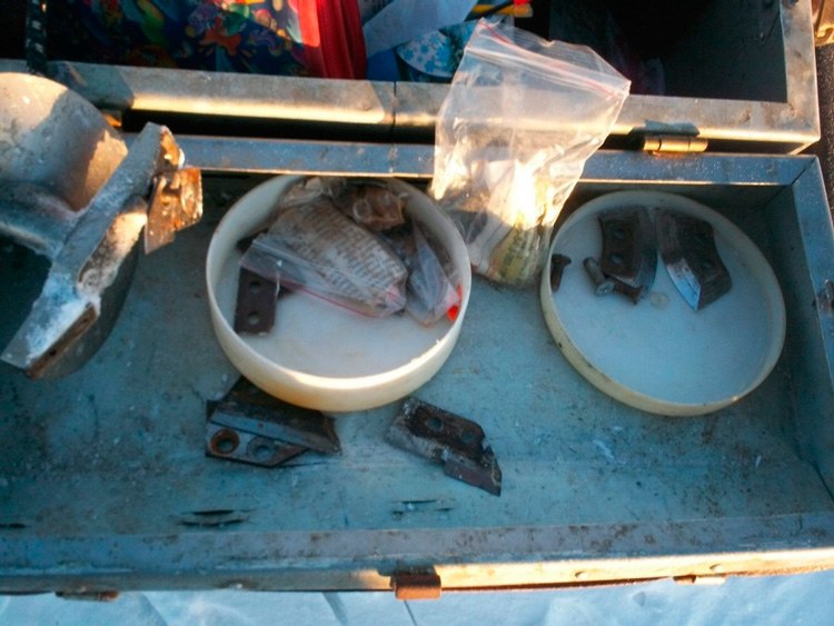 Раскладываю бур, снимаю крышку с ножей - "Мама дорогая!" Режущие кромки все иззубрены! Да, удружил мне сынок в прошлую рыбалку! Попросил его сколотить лёд с бура, предупредил ведь - по ножам не бей! А сам не проконтролировал и не проверил - вот и результат. Такими ножами разве что тёплое.... сливочное масло сверлить. Нужно менять, благо комплектов пять, хоть не новых, но наточенных, всегда с собой - без этого никак нельзя, особенно на Ладоге. Тут частенько, обычно ближе к берегу, попадается лёд с вкраплением песка и ножи "умирают" не сделав и одной лунки.
