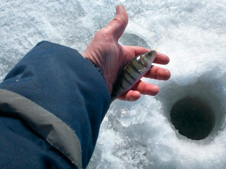 Саня на прикормленной лунке изредка да вытащит то плотвицу, то густёрку, то ёршика, а с окунем глухо. Просверлил в районе нашего авто с пяток лунок, хожу по ним меняю балансиры, блёсна - ничего. Некоторые рыбаки в пределах видимости нет-нет да и вытаскивали мелких окуньков, мне-ж всё не везло. Наконец, когда поставил блёсенку "Скат" с тройничком, замененным на цепочку с мормышкой, попался таки первый окунёчек.