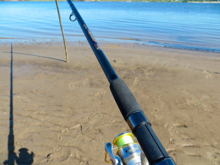 Первый заброс метров на двадцать пять-тридцать. Дальше не нужно. Глубина рядом. Устанавливаю удилище на импровизированную подставку.
