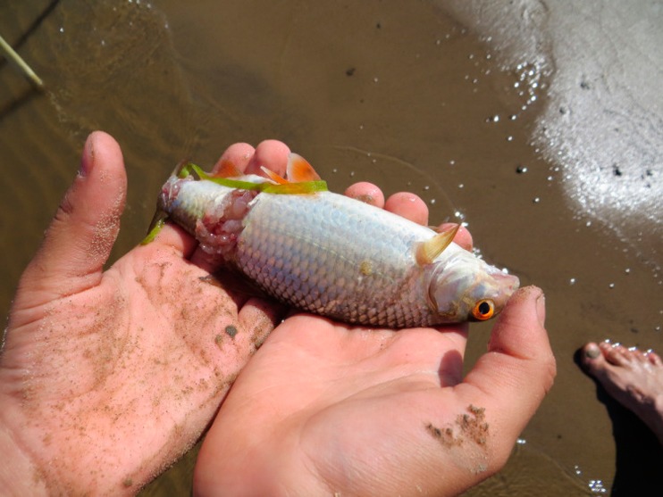 Активность рыбы проявилась лишь на повороте воды, потом подзатихло. Попалась вновь сорожка. Её щука схватила прямо во время вываживания. Вторую рыбку откусила вместе с поводком лесочным. Вообщем, щука не пропускала рыб на берег, как я думал.