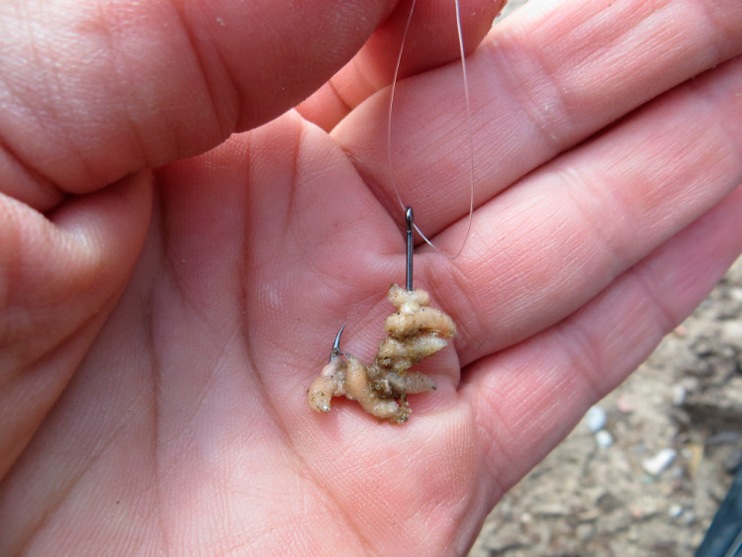 Насаживаю по несколько опарышей. Обычно начинаю с пяти, потом каждый раз подсаживаю по одному свеженькому. Через пять-шесть забросов на крючках получается смачный пучок.