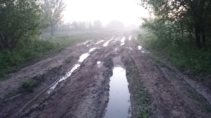 Несмотря на стоящие неподалеку трактора, проезжать дальше не рискнули, по таким лужам только пешком, |