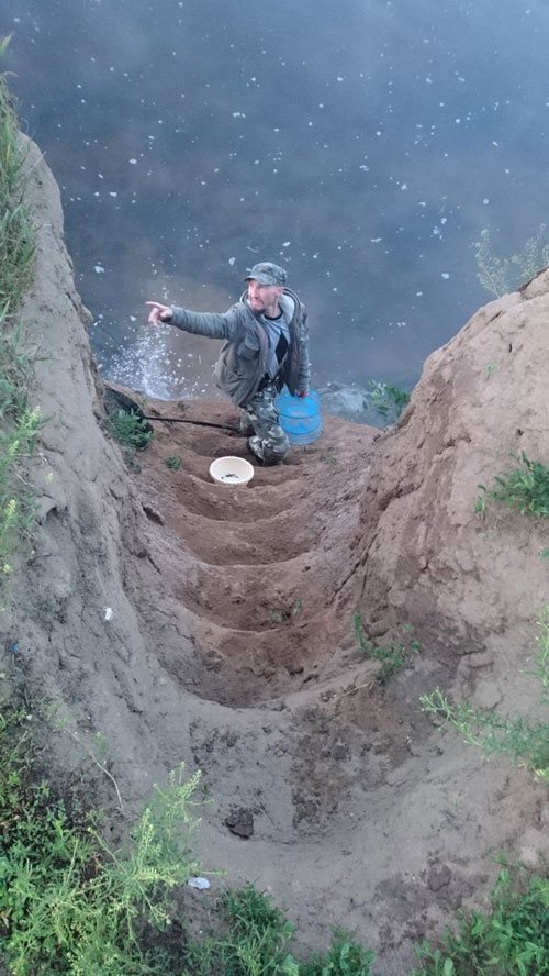 Пока я занимался прикормкой, крестный копал ступеньки и раздумывал, как бы прикрепить садок, чтобы рыба не уплыла вместе с ним. |