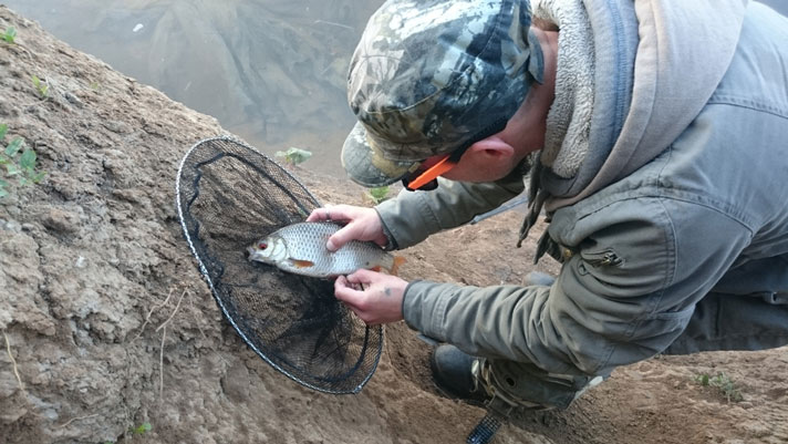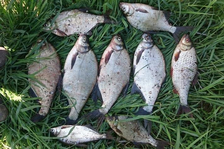 Не успев поставить фидер на рогульку, как кончик резко дернулся, я подсек, крестный уже внизу встретил мою добычу с подсачеком наготове. Первый подлещик уже в садке. |