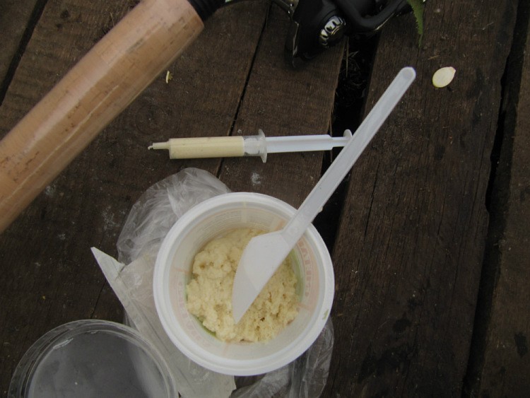 Палочкой натолкал болтушку в шприц, заткнул нагнетателем и, потом нажимая, макаронинкой обмотал крючок. Коли пальцами начинаешь на крючок болтушку прицеплять, дак она на пальцах и остаётся. Так к крючку липнет и потом на удивление держится пару забросов, коли карась не потеребит.