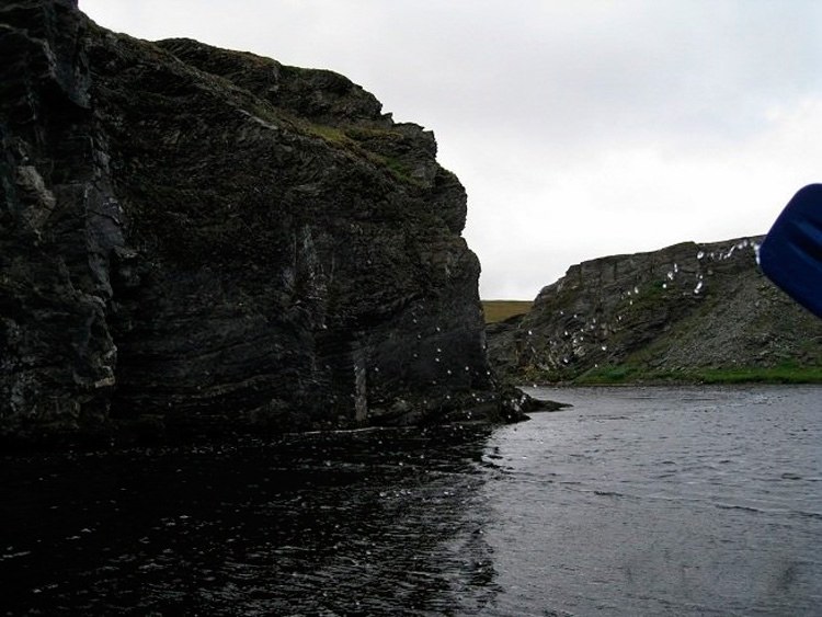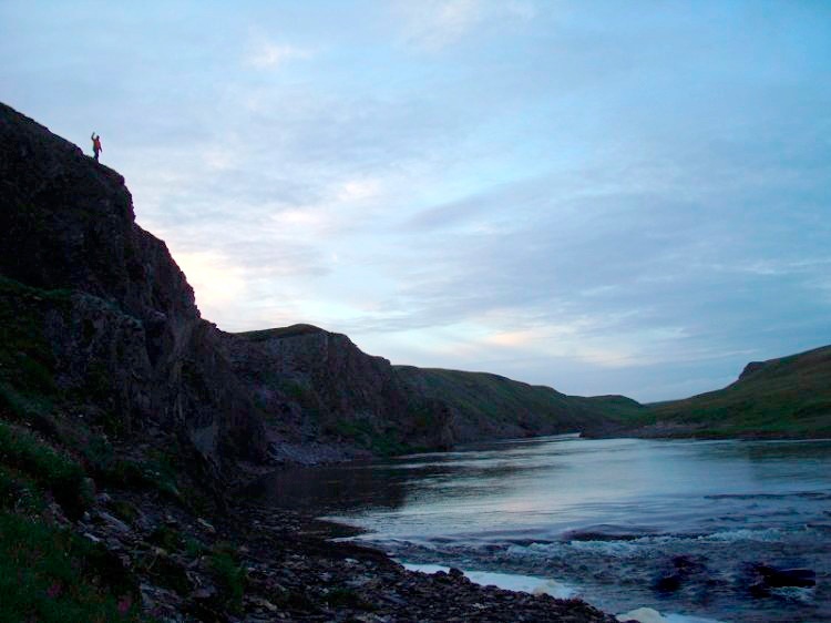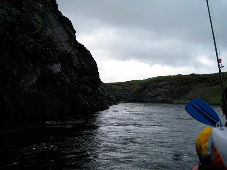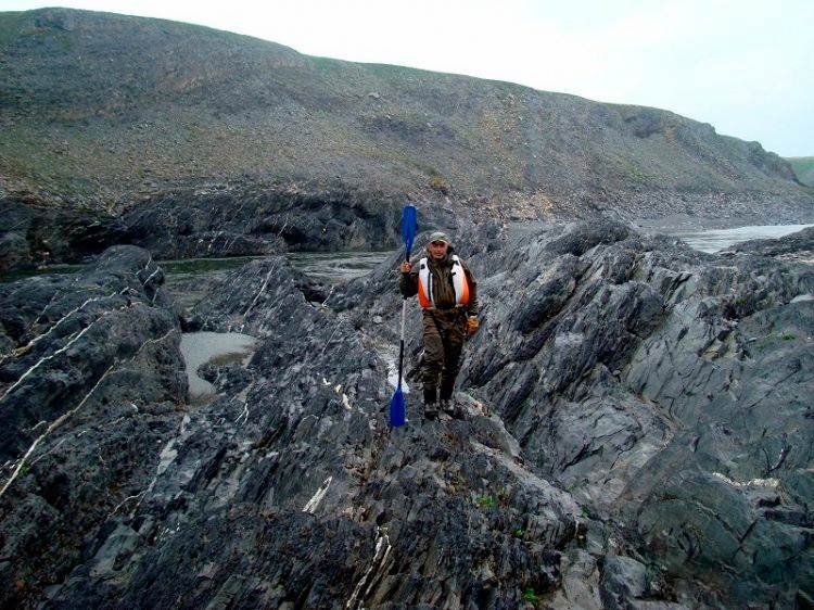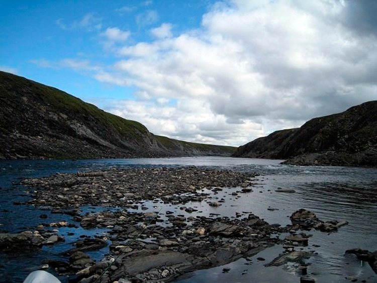 16 километров сплава..... Много это или мало? Точно и адекватно ответить на этот вопрос, пожалуй, не возможно. Это расстояние можно пройти и за 3-4 часа, а можно и пару, тройку дней проковыряться. Река не знакомая и описаний практически нет. Поэтому стартовав, я не знал, сможем ли мы дойти сегодня до базы. Погода не предвещала ни чего хорошего. Как всегда ветер и дождь....Правда, к обеду дождь прекратился, но зато ветер усилился. Впереди был каньон "Чаячий" Он хорошо читается по карте. А каньон - это как правило, какие то препятствия. Либо шиверы, либо пороги, а то и целый набор этих приправ к северной реке. Да ещё вмордувинд усугублял наше продвижение. Но как бы там ни было, а идти то нужно. Пусть ощупью, пусть на цыпочках, но двигаться. Вот мы и продвигались..... с обязательным просмотром всех быстротоков. Ложе реки составлял в основном сланец и был огромный риск порезать лодку... а это остановка на неопределённое время....