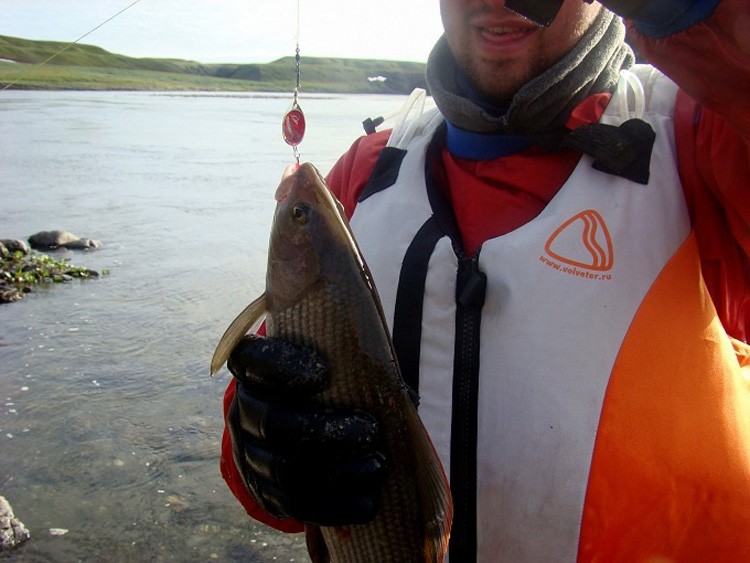 По дороге, безусловно, облавливали все перспективные места...Но картина повторялась. На каждом месте не больше 2-3 рыб.... Часа через 4 после старта мы подошли к устью притока - рекой Тарапетаяхой. В этом месте мы и оторвались по рыбалке.... Хариус клевал практически с каждого заброса. Наконец то всё встало на свои места… приманки работали какие нужно, хариус находился там, где ему и положено было находиться. Хотя нет, было и исключение. Фаворитом на этой рыбалке стала вертушка AQUA COMET красного цвета.