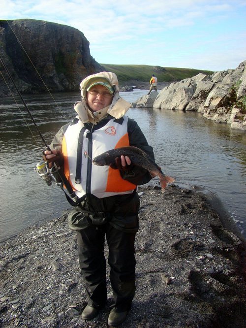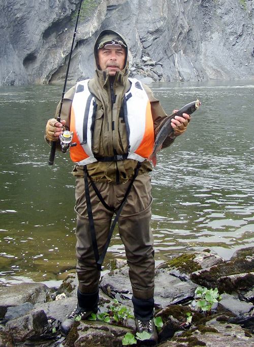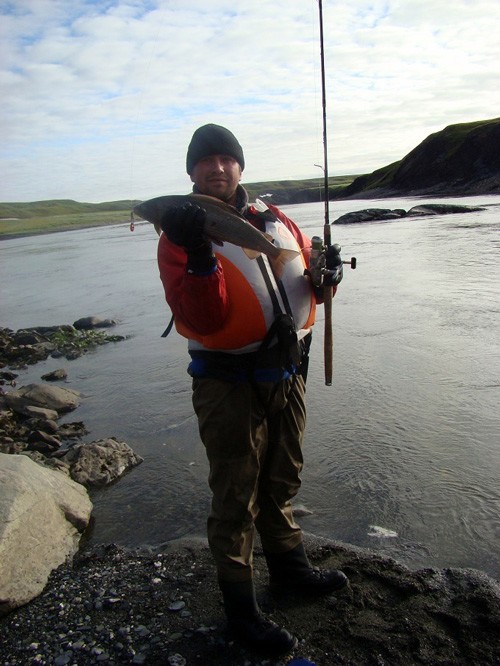Хариус безусловно ловился... Но на муху гораздо лучше, чем на железо. И как в остальных местах - пара, тройка хвостов с одного места и иди облавливай следующие перспективки. Одно радовало - хариус был весь крупный, от 700гр до кило. И наконец то нам кроме хариуса попалась ещё рыбка… Это была горбуша. К сожалению, в этом маршруте это была единственная рыба, представляющая класс лососевых. Видно рановато было ещё, да и погода оставляла желать лучшего. Вода всё ещё оставалась мутной. Горбуша позарилась на вертушку AQUA VELTIC медного окраса №1.Эта вертушка мной выбрана не случайно, дело в том, что сразу за порогом была хорошая, глубокая яма глубиной где то метра 4. Что бы обловить нижние слои воды нужно было что то тяжёлое. Вот и выбрал я VELTIC. И не напрасно.