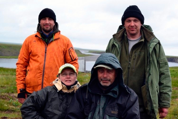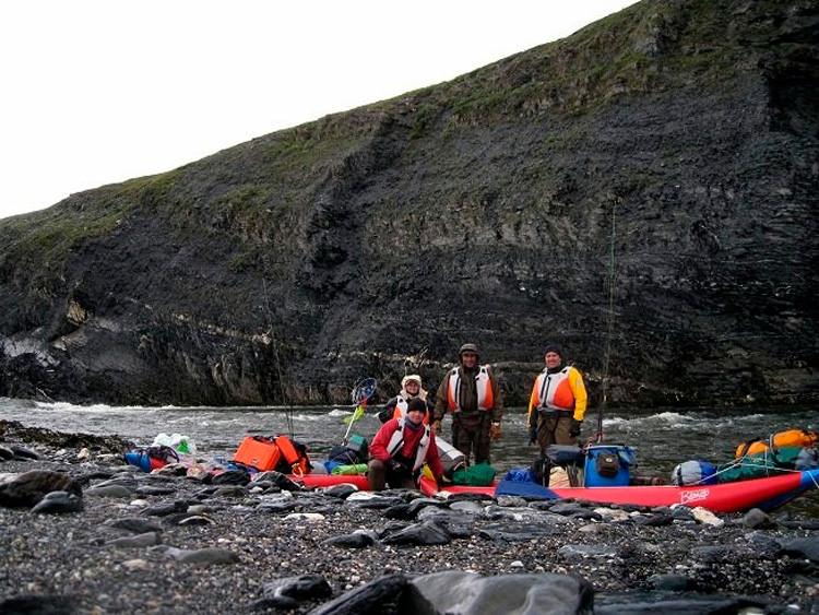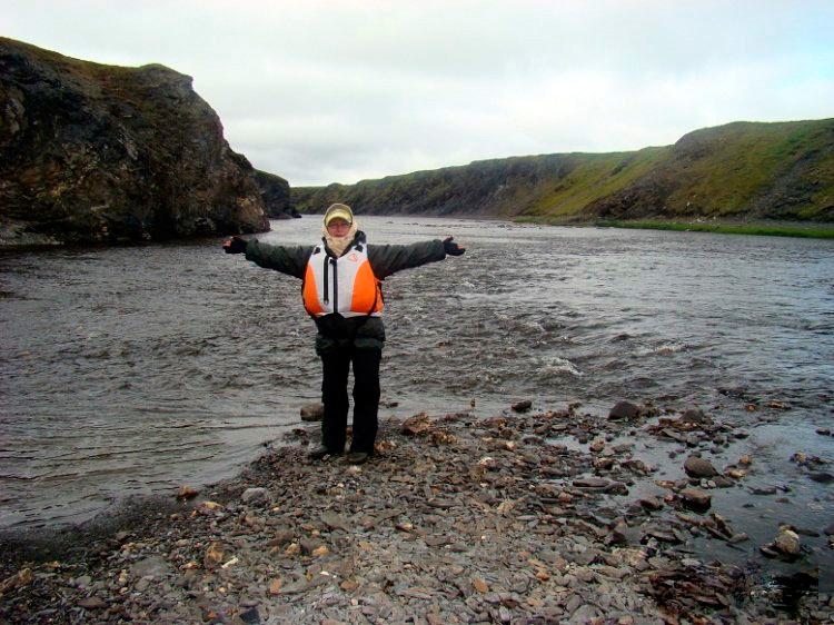 До базы оставалось всего то 5 километров спокойной, вялотекущей воды. Позади остался каньон со всеми прелестями...казалось бы греби себе в своё удовольствие. Час вёслами помахать и финиш. Но куда там. Как только вышли из каньона, нас буквально сдуло ветром. Ветер как всегда дул в....ну вы догадались. Километр мы шли около часа. Я уже начал подумывать о том, что бы разбить лагерь и дождаться ночи, а там и ветер чуть стихнет, и можно будет идти. Но о чудо!!!! Ниже по реке показалась лодка моторная с людьми...Батюшки, да это наши парни. Повезло. Музчины приехали на базу чуть раньше(на день) запланированного, что бы порыбачить. Быстренько привязываем байдарки по бортам моторной лодки и с комфортом завершаем маршрут. Вот мы и в конечной точке. База в устье Великой.