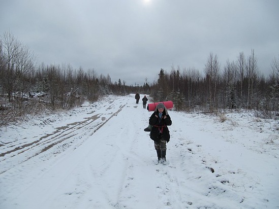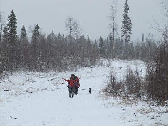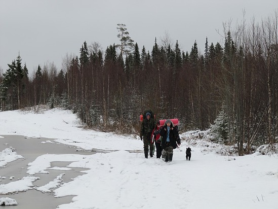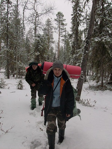 Можно было вполне на мотобуксировщике ехать. Я ж в последний момент заробел и не стал брать. Теперь тащим вещи на себе.