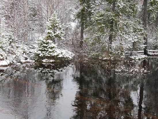 Молоденькие ели будто пошли купаться, и опустили ветви в воду, проверяют насколь тёплая.