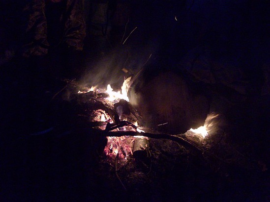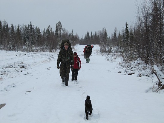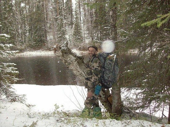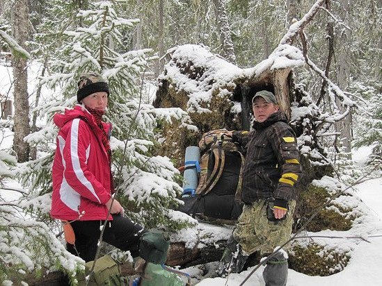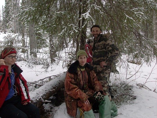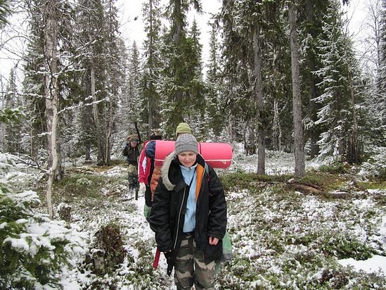 Присели отдохнуть. Смотрю, мой отряд постепенно из сил выбивается. Да ничего, километра полтора осталось не более. Миша, тож под ёлку залез. Устал малой. В первый раз бывает.