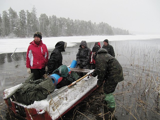 Толик им в помощь. Лёд не везде протаял. Придется лодку волоком тащить