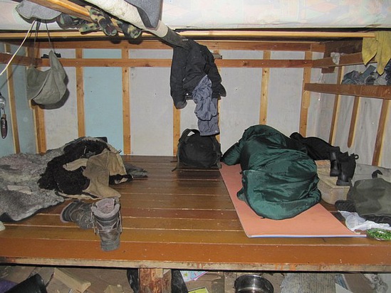 Шубы, сменная одежда разложены на нарах, похоже, кто-то нежился да не убрал :) Посуда в основном чистая, подметено, в ведре оставлена вода. И то добро, хоть мороза нет, то бы до свиданья ведерко.