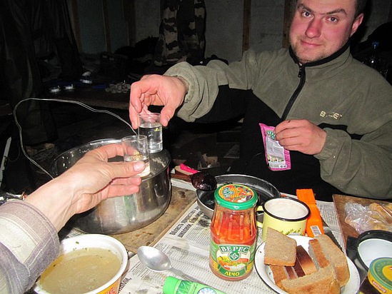 Вернулись в избушку. Взялись за хозяйство. Мне выпало за водой топать. Майну пробил. Воды набрал. Намыл кастрюлю из нержавейки. Новое приобретение избы. Спасибо, ребятам, которые оставили. Сковородку, чёт ещё делал. Да-а, вспомнил, стал из мешка спальники вынимать. Обнаружил, что друзья, вскрывшие террасу, один спальник и турковрик прихватизировали :))) От же беднота:) В следующий раз опять придётся везти, то нас ведь двое приезжает. Я и Любимая :)