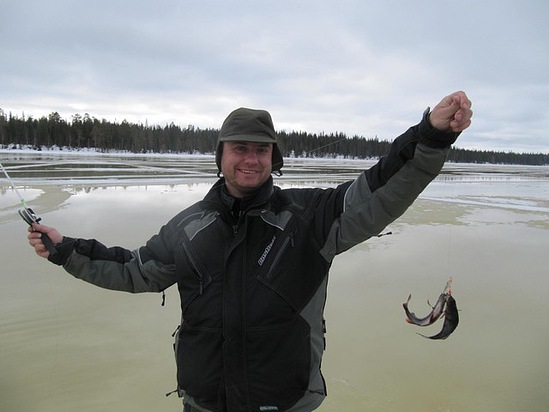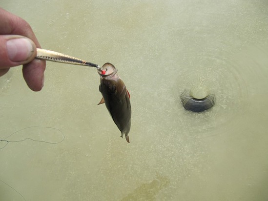 Меняю «Срез» на «Малька». И сразу же в следующей лунке поклёвка. Промахнулся. Вновь подкидываю, замираю. Тычок. Еся!