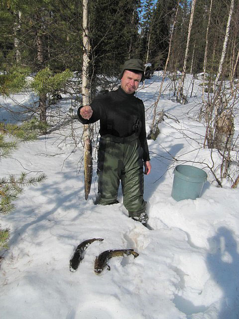 Описывать его не имеет смысла, был он не из легких, по сравнению с дорогой к избе, казался просто игрушкой. Самое смешное, что в километре от трассы издалека увидели светлячка в снегу. Подъехали. Это же мой фонарик лежит и светится. Так сказать, прошел тест драйф на двое суток работы. Батарейки до сих пор действуют, пользуюсь. Домой приехали лишь ночью. Сане досталось распуты, грязи, колдобин. Выдержал. Я почти дорогу проспал. Помощничек :))) Улов порадовал домашних.