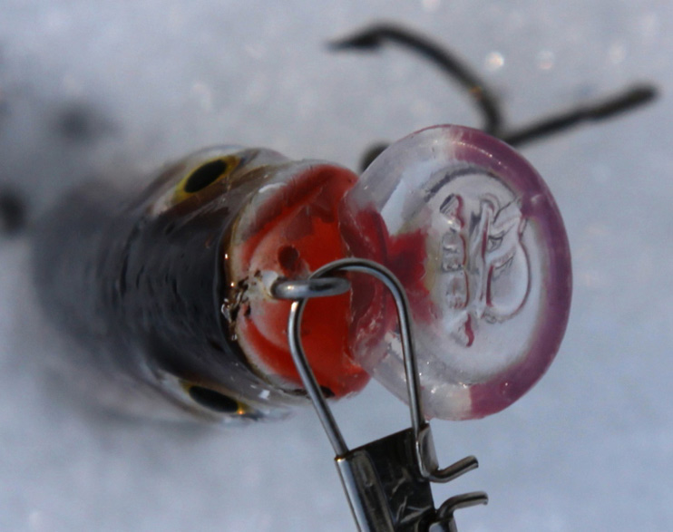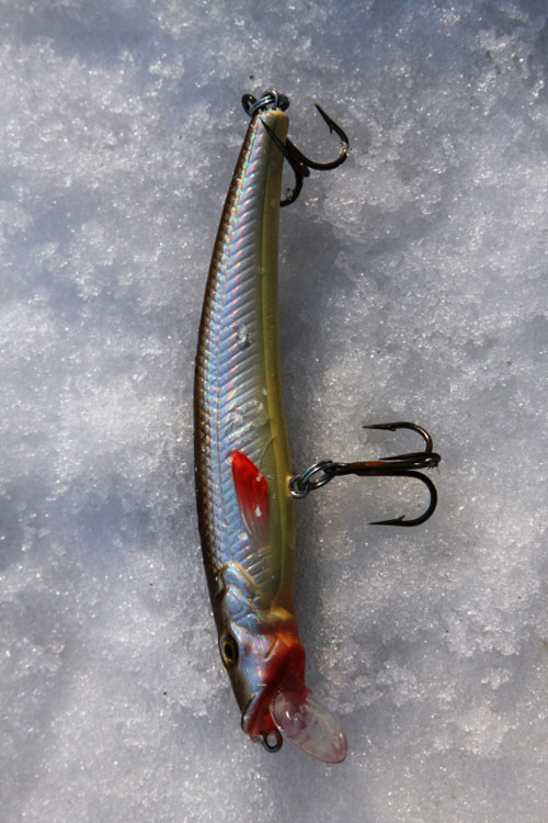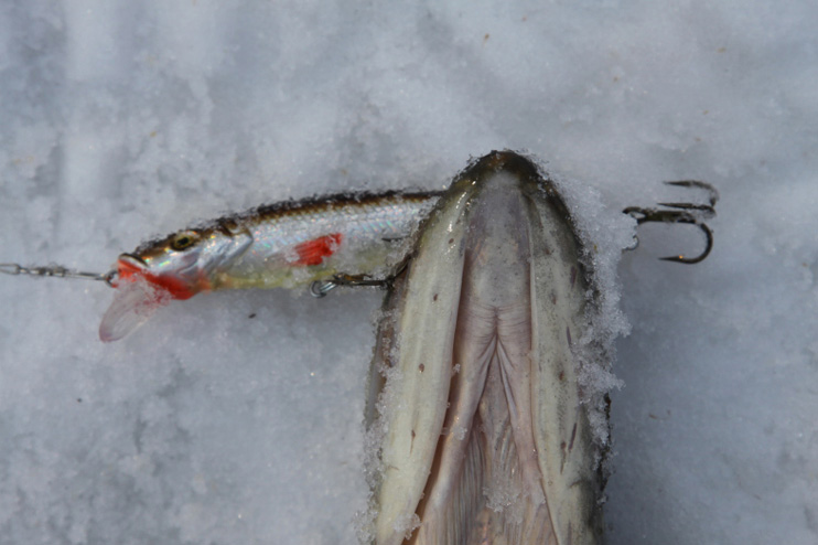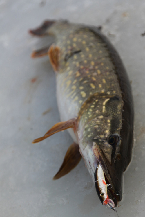 И вот я делаю первый заброс навесом метров на пять перед собой, просто, что бы оценить игру воба при твичинге более жёсткой палкой, как вдруг из под закраины буквально у меня из под ног неожиданно вылетела щука, щёлкнула пастью мимо воблера и тут же снова метнулась назад под лёд. Вот это начало! Первая порция адреналина попала в кровь, щучка была явно не шнурком. На втором забросе ситуация повторилась в точности - заброс, выход (точнее вылет), промах и такое же молниеносное возвращение назад в укрытие. Появился дикий азарт, но на следующих трех-пяти забросах в то же место ничего не произошло. Решил попробовать выманить пятнистую из засады вторым воблером и вернулся метров на пять выше по течению за другим, лапшеподобным спиннингом. Что бы лишний раз не шуметь, ходя по тонкому льду закраины, забросил в то же место но с чуть большего расстояния, и на первой же проводке та же самая щука но на два метра ближе точно так же вылетела из засады и на этот раз не промахнувшись, схватила моего прошлогоднего любимца. Несколько секунд борьбы и пятидесяти двух сантиметровая щучка массой 1060 грамм (всегда вожу с собой сантиметр и весы, т.к. всю рыбу почти всегда отпускаю) была на льду. Начало есть, Воблер AQUA MACHNO и моя анимация вызвали интерес у первой щуки. Выпускаю пятнистую красавицу и иду дальше, продолжая испытания.