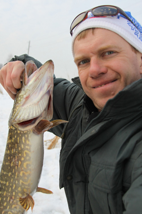 Ну а про то, что было дальше, могу сказать так: хотите - верьте, хотите – нет, но всё было именно так, как оно было. Совершенно опустошённый (адреналин уже переработался и разнёсся кровью по всему телу) делаю с этой же точки заброс метров на 10 дальше предыдущего, результативного. Снова только начал лёгенький твич у соседней закраины, как вдруг в очередной раз кто-то очень сильный резко схватил моего уже слегка покусанного нового питерского друга и мощным рывком снова утащил под лёд. Всё произошло так быстро и неожиданно, что я даже не успел испугаться, только мой довольно жёсткий спиннинг изогнулся в дугу, и я впервые узнал, что означает выражение визг фрикциона . Длилось это, как мне теперь кажется, около секунды, потом прямо подо льдом раздался глухой всплеск, точнее даже «бульк» и пустая приманка вылетела из воды. Я думал, что этого уже не переживу. Ноги стали совсем уже ватными и еле держали. Но я снова подматываю воблер, затягиваю намертво фрикцион катушки и снова забрасываю в то же самое место. И почти сразу случилось что-то по ощущениям очень сильно напоминающее глухой зацеп. Как будто воблер просто взяли сильной невидимой рукой и зацепили одним уверенным движением за бревно. Типа он шёл себе спокойно под моими лёгкими рывочками у дна, а теперь просто взял и остановился, точнее застопорился , просто зацепившись намертво за что-то, что я не мог сдвинуть с места. Очень быстро на меня обрушилось осознание того, что это что-то шевелится. Я почувствовал, что оно даже пытается плыть от меня, не смотря на максимальную дугу, на которую способен мой спиннинг. Поняв что подтащить соперника к себе да ещё и против течения мне не удастся, я крутя ручку катушки сам пошёл по тонкому льду к тому месту где плетня уходила в воду. Пройдя метров десять я наконец увидел того кто так крепко держит малыша Махно. Глубина была небольшая и я уже начал обдумывать вариант с заходом в воду. Я был в болотных сапогах, но полной уверенности, что не зачерпну в них ледяной воды не было. Отказавшись от этой идеи начал пытаться всё же тащить монстра на лёд. Сначала вытянул из воды огромную голову, потом в два этапа всё остальное тело и хвост и вот она, победа!