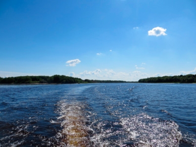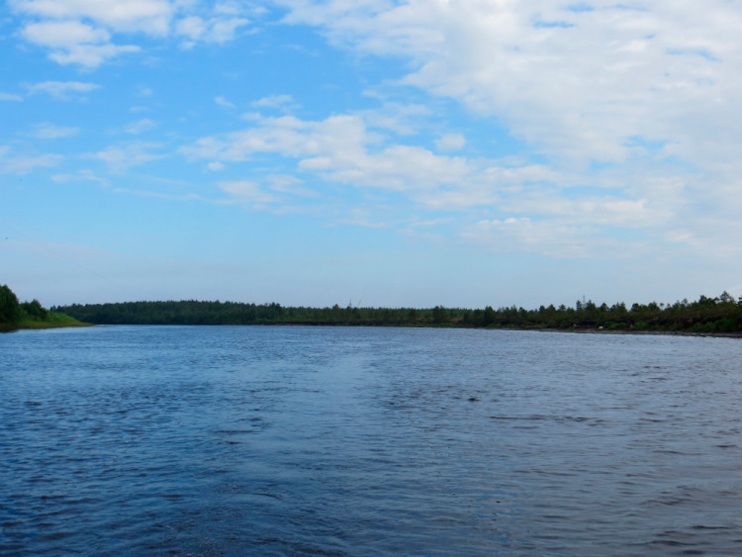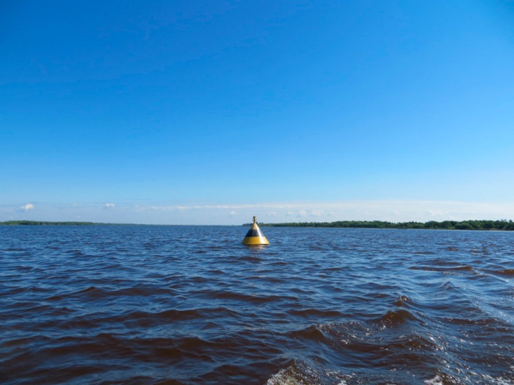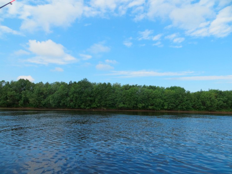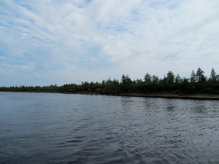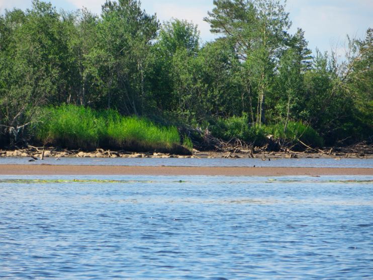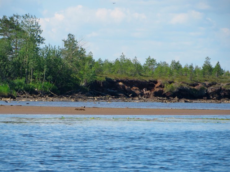 Поднялись с километр, дальше поняли «труба на бане». Мели стали до 30 сантиметров. Удовольствие от отдыха не стали превращать в удовольствие от прорыва к цели. Повернули в обратку. Через час вышли из реки Лаи на просторы Дельты Двины. Слева берега размытые, старые корневища, как противотанковые надолбы для спиннингистов приготовлены