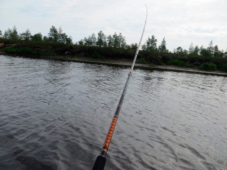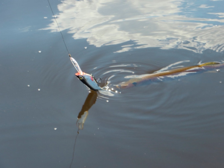 Пригружали воблер, типа отводного поводка с грузилом. Нитку использовали новенькую.