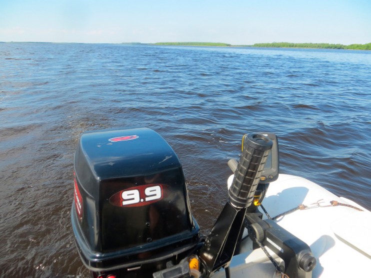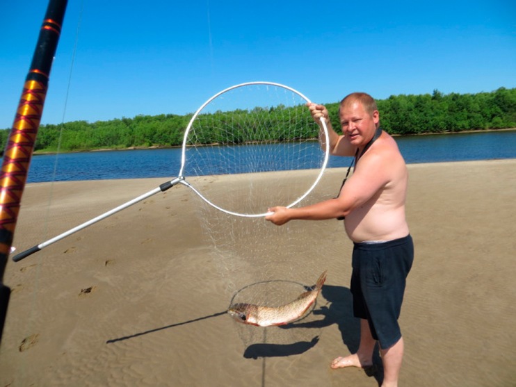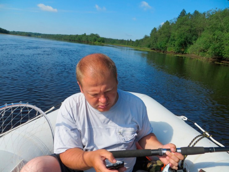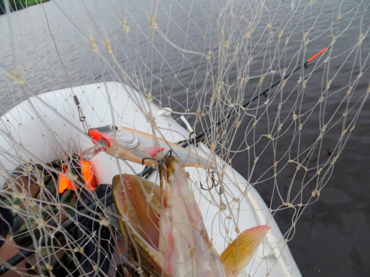 Ветерок дул попутный, моторчик миролюбиво урчал, плыли в сторону Архангельска. Никогда не думал, что можно так легко от реки Лаи до города дойти. Примерно где-то напротив реки Исакогорки новая атака. Мне показалась, что рыбина сильнее тянет предыдущей. Миша же сказал, будет крупнее, нитку перережу, то нас закусает. Тут забыл его слова, кричу: «Крупнее». Он подсачник схватил и с борта свесился. Ничего, себе думаю, нитку, он её сам руками схватит :) Подвели к борту, подняли. Небольшая, всё равно в радость.